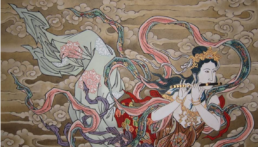 Le tennyo sono donne bellissime che attraversano il cielo con le loro tuniche e le lunghe sciarpe magiche che ondeggiano al vento. Suonano il biwa (liuto giapponese) o il flauto e sono circondate da boccioli di loto.